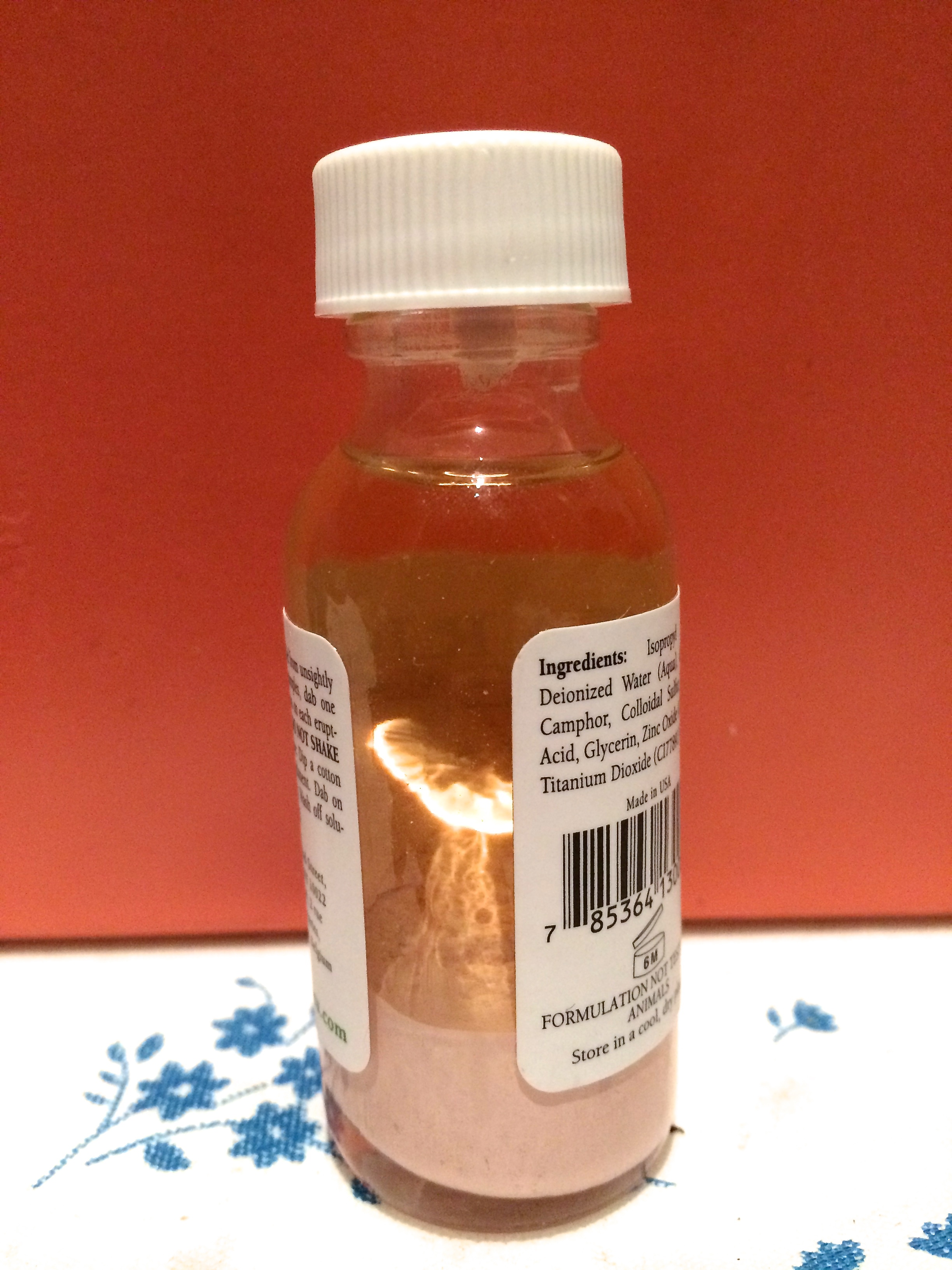 Inside this glass bottle contains active ingredients like salicylic acid, calamine, camphor & titanium dioxide which helps dry out the white head immediately. As you can see from the photo above, there’s 2 separate layers – liquid & powder. Keep it that way and don’t shake it up before application.
