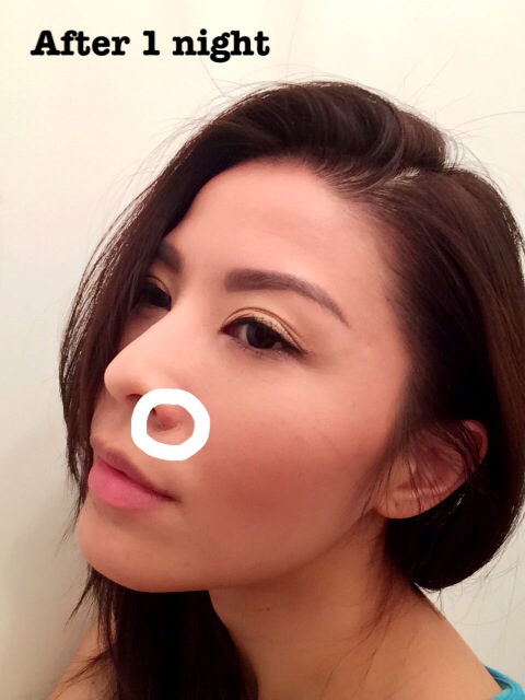 I know I have make-up on in the after picture, but you can really see how the pimple is dried up, flattened and the skin is flaking off for new skin to grow and it is easily concealed with some concealor without a nasty bump on your face.